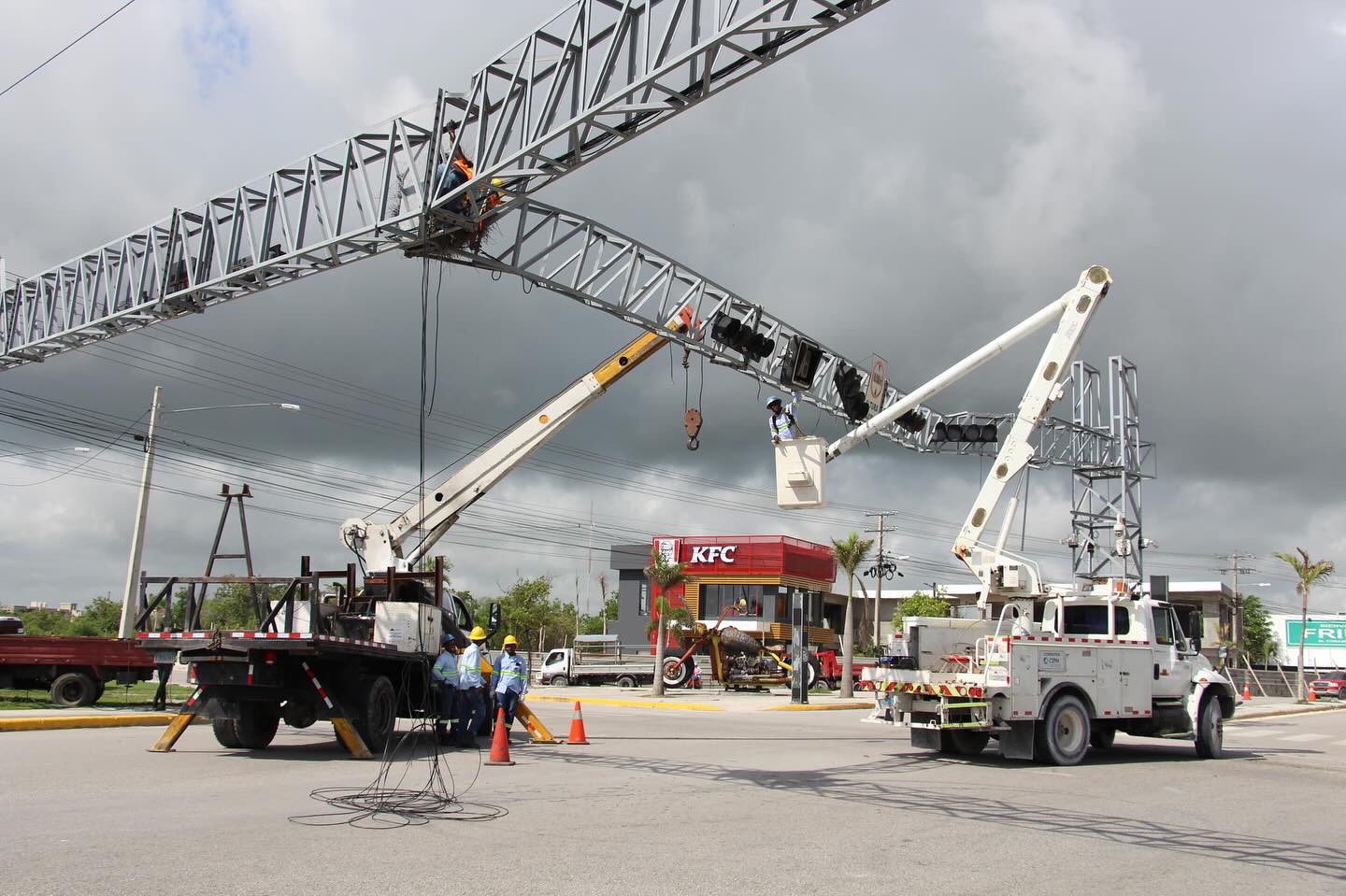 Verón Punta Cana – Por instrucciones del alcalde Ramón Antonio Ramírez (Manolito), se procedió la mañana de este viernes, en colaboración con la DIGESSET y CEPM, a reparar las torres que sujetan los semáforos del cruce de Friusa.