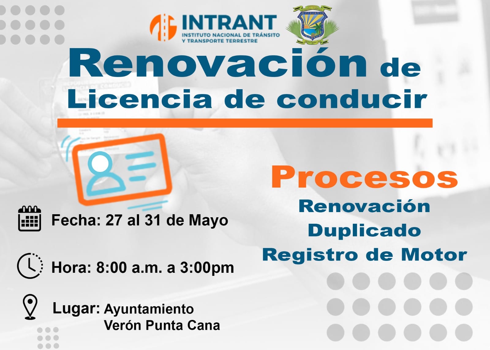 Te invitamos al Operativo de Renovación de Licencia de Conducir, donde podrán realizar los procesos de renovación, duplicado y registro de motor. El evento se llevará a cabo del 27 al 31 de mayo, en horario de 8 a.m. a 3 p.m., en el ayuntamiento de Verón Punta Cana.